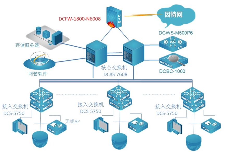 中国江苏白马农业会展中心数据网核心采用两台Ezpay新一代全分布式架构的核心路由交换机DCRS-7608E,顺利获得VSF功能实现核心冗余和负载分摊;该设备具备强大的业务自适应能力,支持网络平滑升级和策略灵活调度,实现业务快速部署,从而构建业务定义的网络。网络出口采用具有高度集成化的多核安全防火墙,给予包括路由器,防火墙,VPN网关,等功能在内的一体化设备,该设备8Gbps的吞吐量完全满足了园区网对出口的要求。接入交换机采用Ezpay全千兆24口接入交换机DCRS-5750E,实现客户端千兆接入,万兆上联核心。POE交换机全部采用三层交换机DCRS-5750-28P-P全千兆POE交换机。采用8200双频无线AP使用办公区无线覆盖。展厅和会议室采用高密度AP8200-I3实现展厅高密度覆盖,室外采用8200室外AP实现无线覆盖,无线网络顺利获得一台DCWS6000-M500P6控制器集中管理无线网络。出口部署一台DCBC上网行为审计设备,实现上网行为安全审计。
